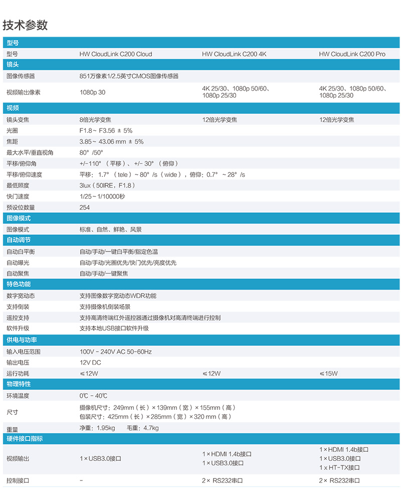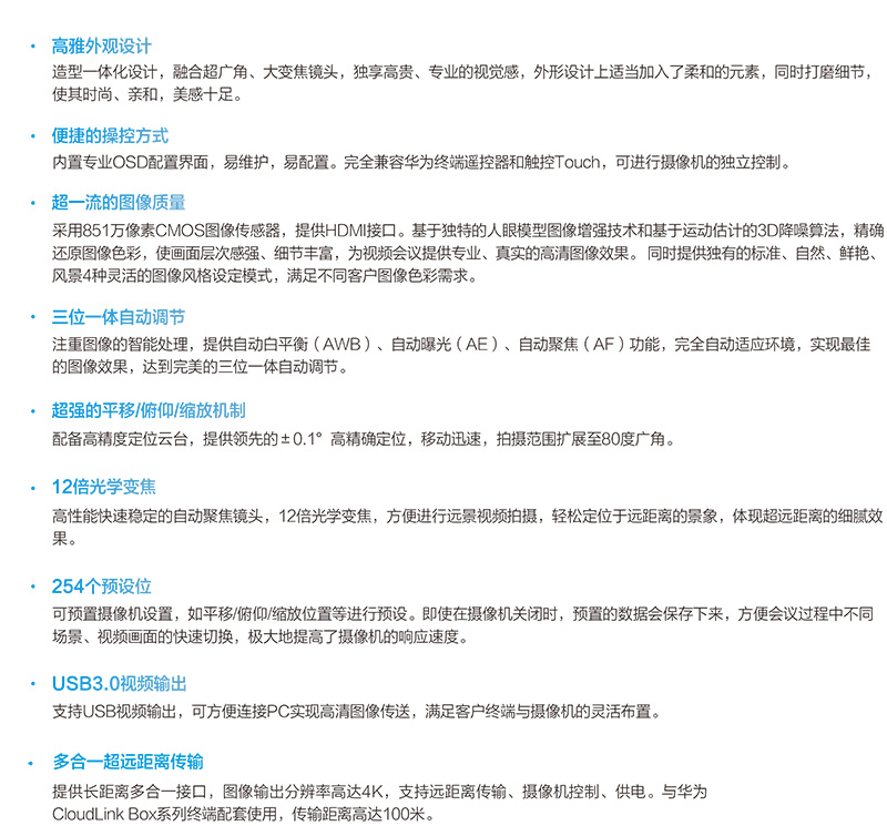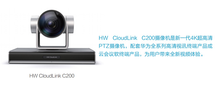 HW CloudLink C200摄像机是新一代4K超高清PTZ摄像机,配套华为全系列高清视讯终端产品或云会议软终端产品,为用户带来全新视频体验。