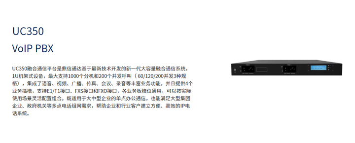 鼎信通达 UC350 用于帮助中小企业和行业客户建立方便,高效的IP电话系统。它是机架式19寸宽1U高设备,提供4个用户板接口,可支持FXS、FXO和E1语音接口。最大支持1000个注册分机和200个并发(60/120/200并发3种规格),既可以通过VoIP分机实现远程办公,也可以通过与其它IPPBX或者传统PBX对接,从而实现用户多样化需求。另外,UC350支持多种VPN连接方式,以及加密和安全策略,从而更好地确保通信安全。它可广泛应用于中小型呼叫中心,企业分支机构,以提高沟通效率,节约通信成本。