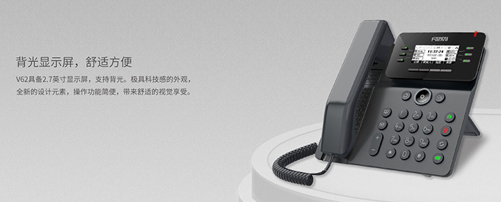 V62 是一款集音频和智能应用于一体的多功能商务话机,专为企业办公设计。原创美学设计风格,V62 拥有 2.7 英寸黑白屏,超高清的华丽音质,集成 USB2.0 接口,为用户提供卓越的交互和舒适的即时互联沟通体验。
